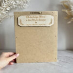 Aniołek wykonany ze sznurka bawełnianego w kolorze białym oraz drewnianych dodatków trzymający w rękach drewniane serduszko z grawerem. Aniołek siedzi na huśtawce w drewnianej ramce ozdobionej suszonymi trawami i kwiatami. Na górze jest drewniana tabliczka, na której umieszczę Twój tekst. Z tyłu mogę dodać większą tabliczkę z życzeniami, modlitwą lub dedykacją, co sprawi, że podarunek stanie się jeszcze bardziej osobisty – możesz to określić w opcjach zamówienia. Dodatkowo daję możliwość wyboru koloru włosów dla anioła.