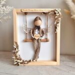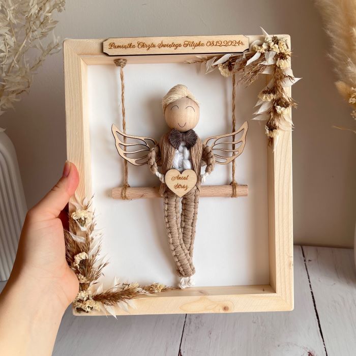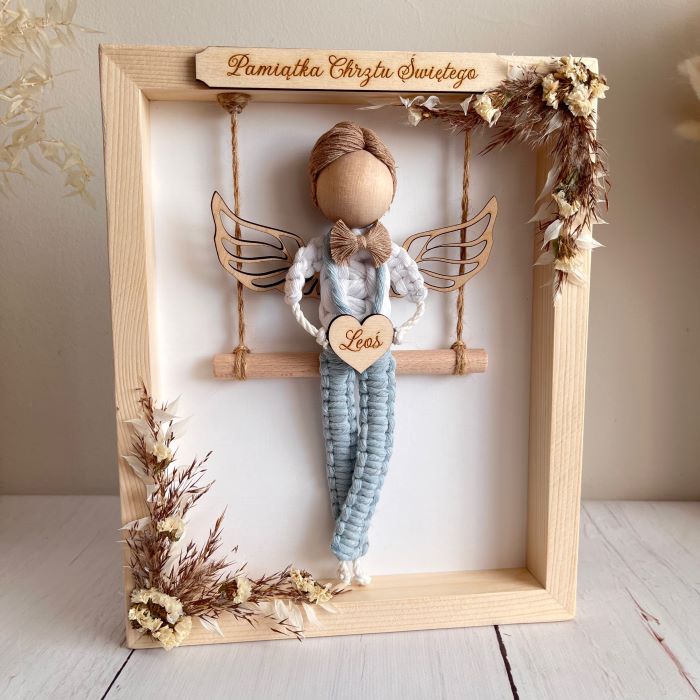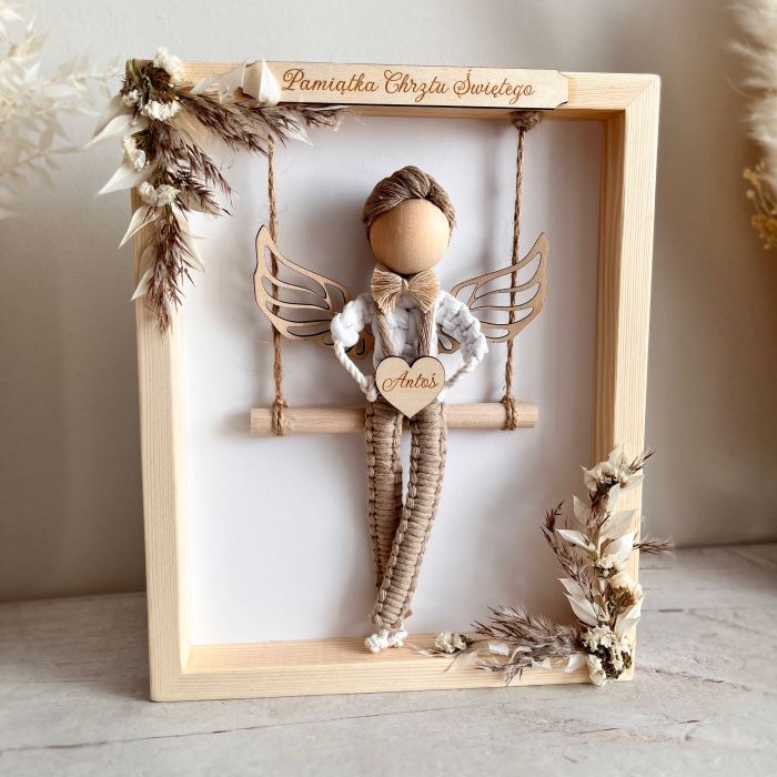 Aniołek wykonany ze sznurka bawełnianego oraz drewnianych dodatków trzymający w rękach drewniane serduszko z grawerem. Aniołek siedzi na huśtawce w drewnianej ramce ozdobionej suszonymi trawami i kwiatami. Na górze jest drewniana tabliczka, na której umieszczę Twój tekst. Z tyłu mogę dodać większą tabliczkę z życzeniami, modlitwą lub dedykacją, co sprawi, że podarunek stanie się jeszcze bardziej osobisty – możesz to określić w opcjach zamówienia. Dodatkowo daję możliwość wyboru koloru włosów oraz ubranka dla anioła.