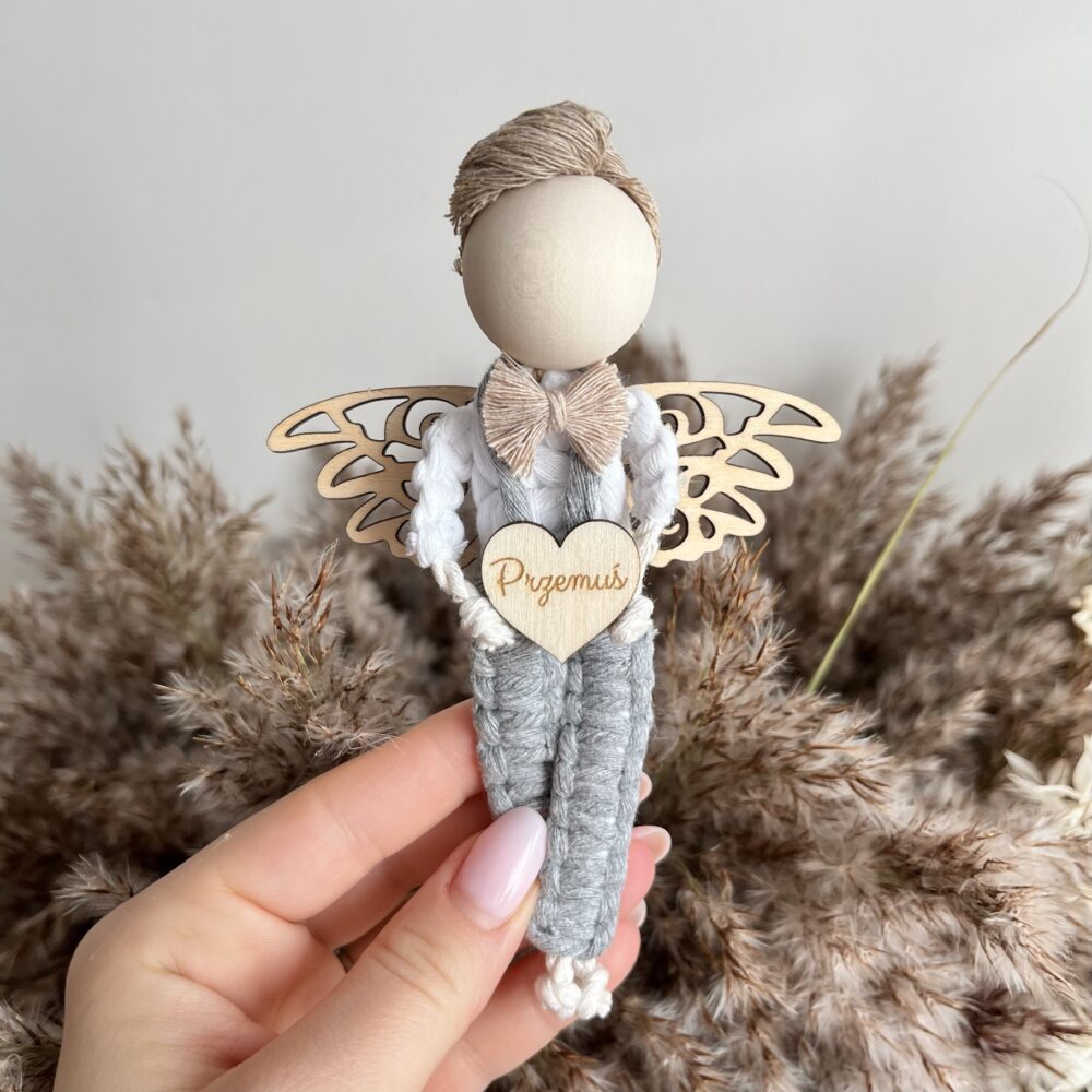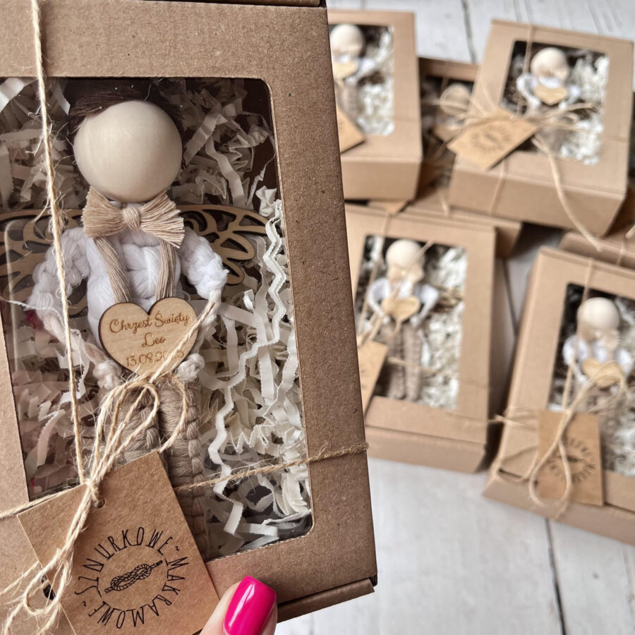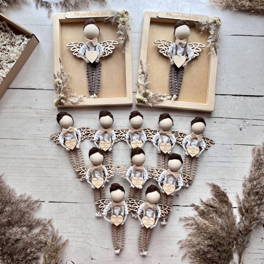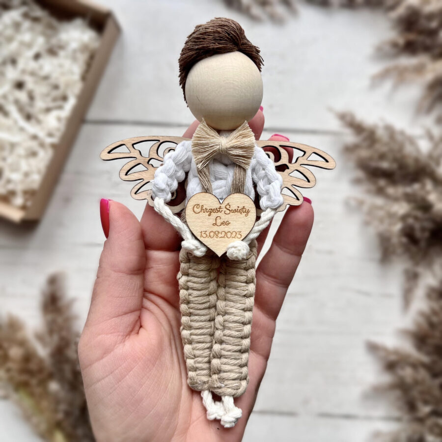 Personalizowany aniołek z makramy to drobiazg, który będzie idealną formą podziękowania dla gości za udział w uroczystości Chrztu Świętego lub Komunii. Sprawdzi się również jako niewielki prezent z okazji urodzin lub Dnia Ojca.
