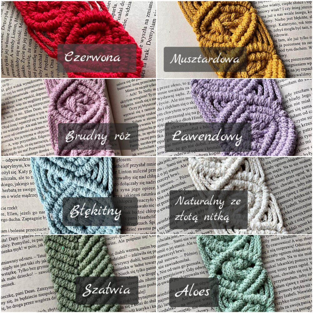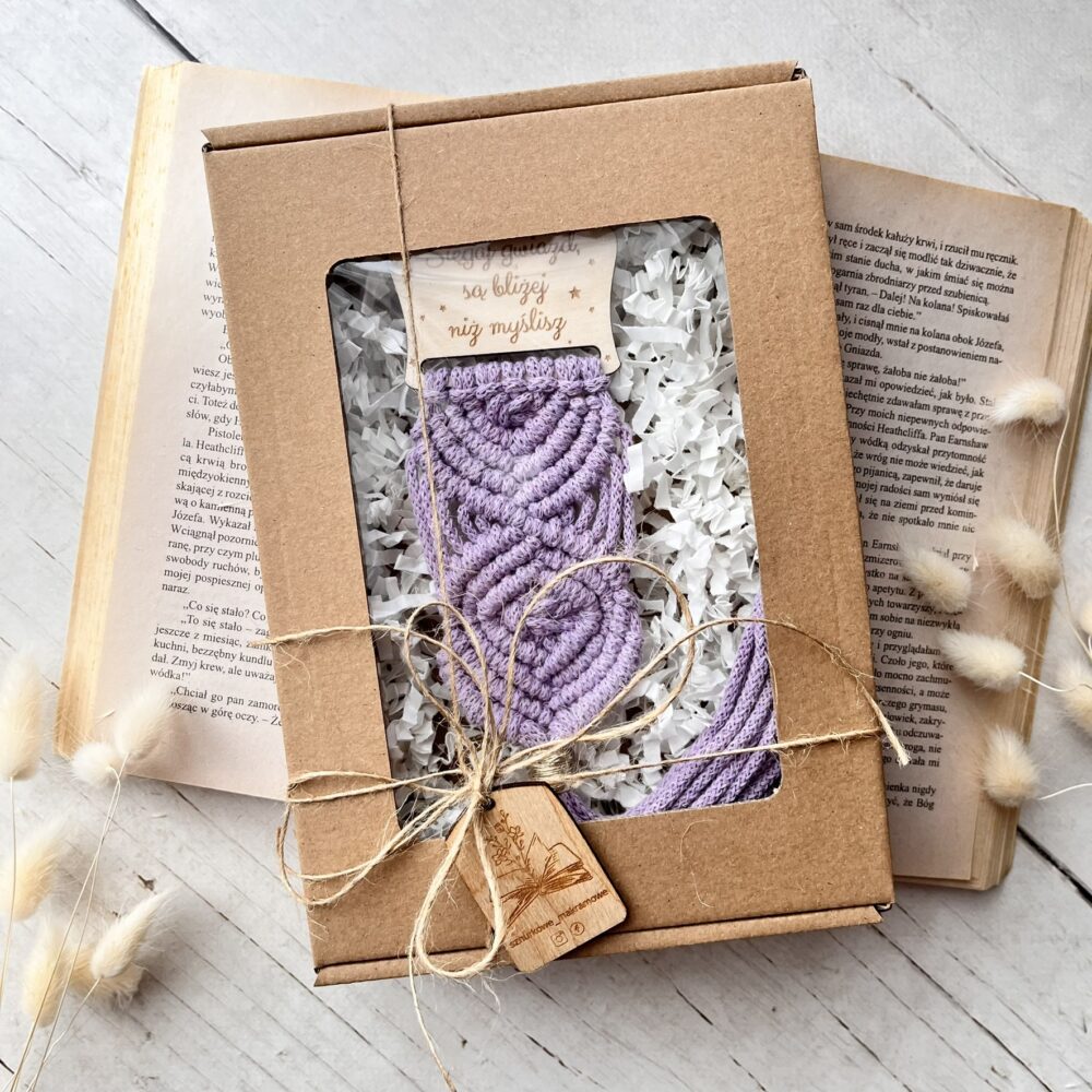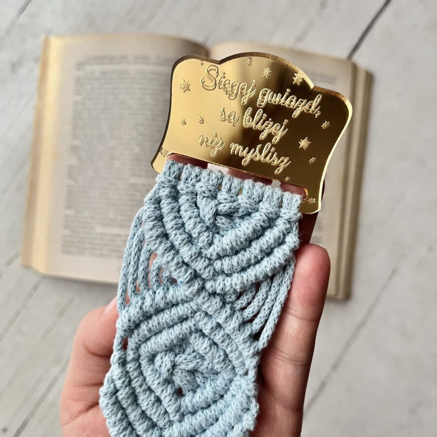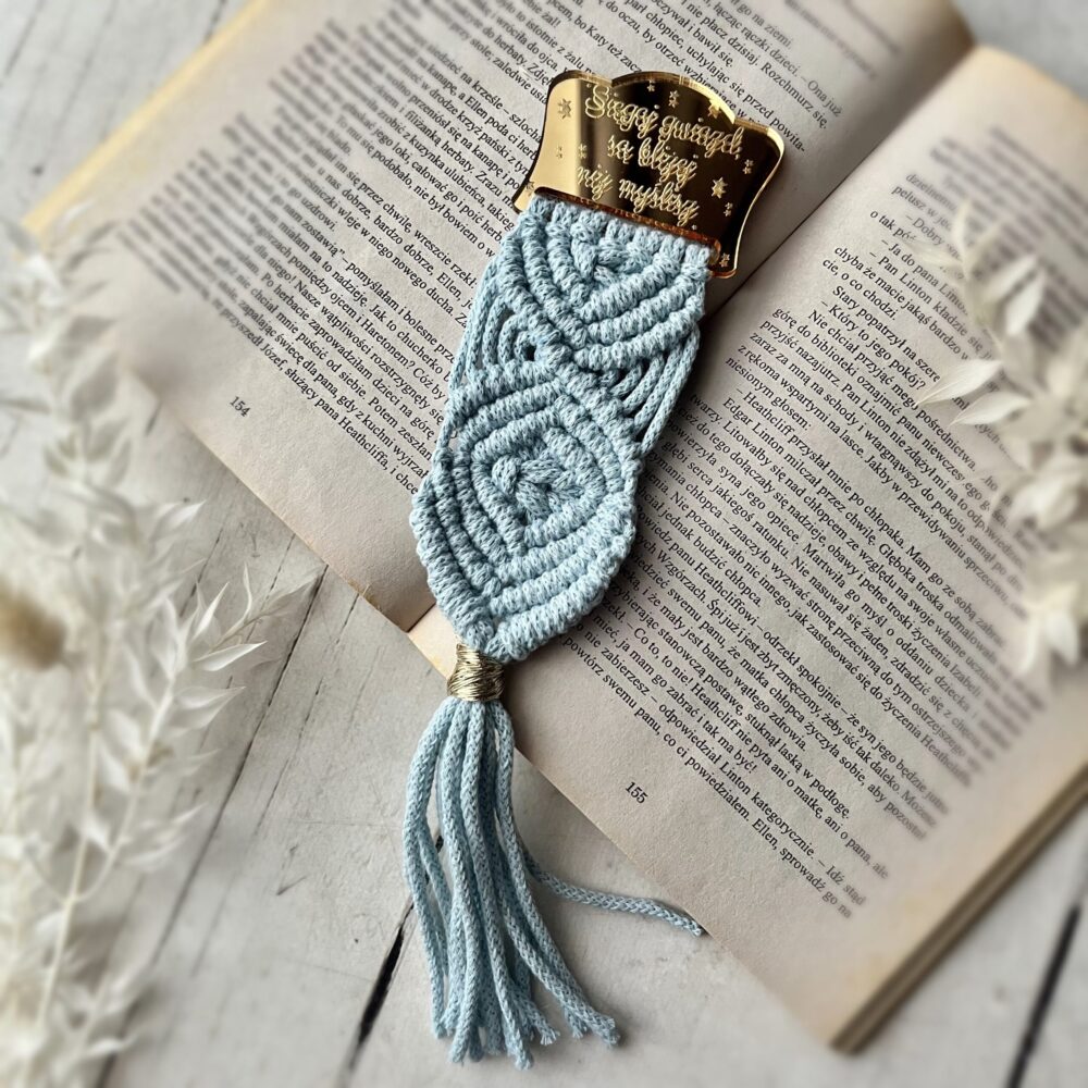 Makramowa zakładka do książki wykonana ze sznurka bawełnianego z lustrzaną bazą z grawerem.