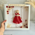 Ramka ma wymiary 27×27 cm. Ramka posiada z przodu szybkę plexi, dzięki czemu utrzymanie jej w czystości jest bardzo proste. Można ją powiesić na ścianie lub postawić na półce. Każdy element tworzę ręcznie, dlatego każda praca jest unikatowa i niepowtarzalna.