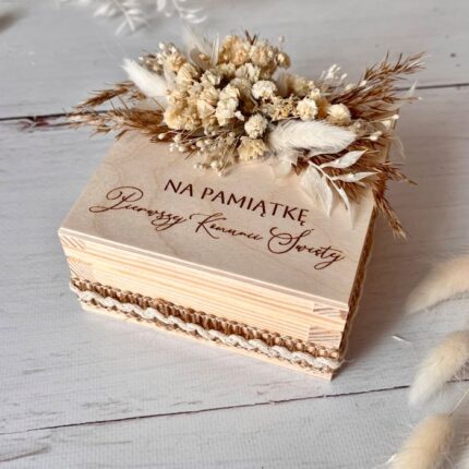 Drewniana szkatułka sprawdzi się również po ślubie – jako pudełko na biżuterię lub miejsce na cenne wspomnienia. Co więcej, front z grawerem i personalizacją nadaje całości unikalny styl.