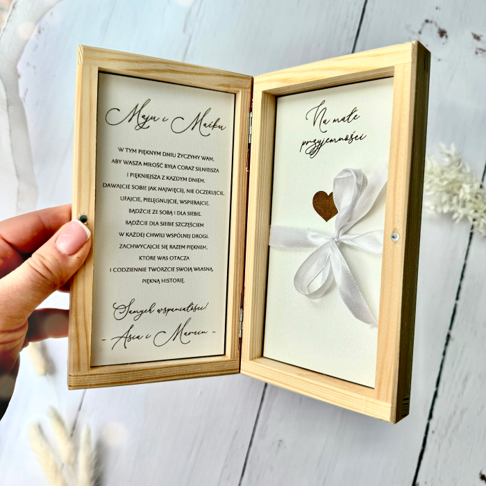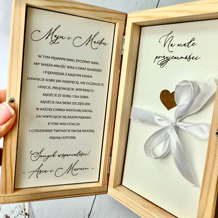 Drewniane pudełko na pieniądze z życzeniami, personalizowany prezent ślubny