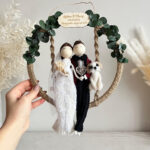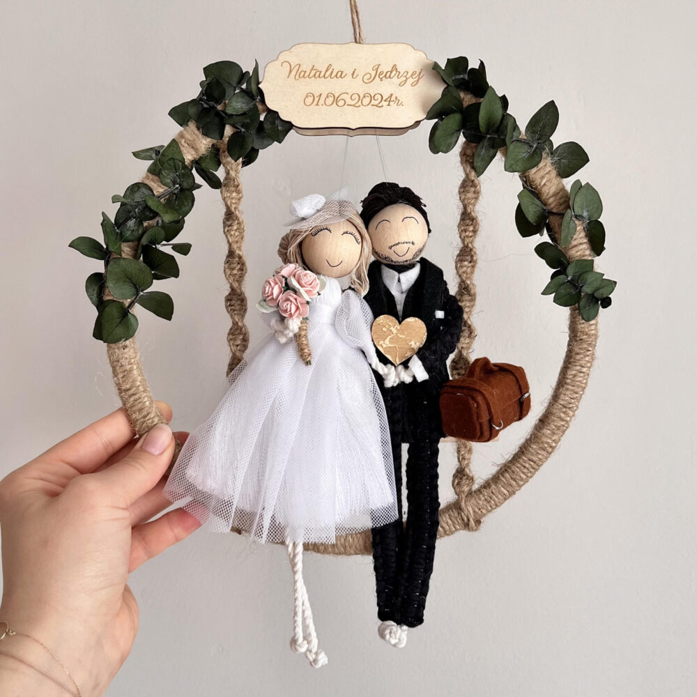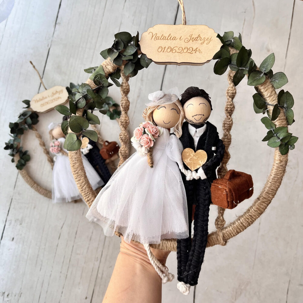 Makramowe laleczki w obręczy z eukaliptusem to niezwykła pamiątka, która pozwoli uwiecznić w wyjątkowy sposób jeden z najpiękniejszych dni w życiu dwójki kochających się osób. Urocze laleczki, które tworzę na symbol rzeczywistych osób to nie tylko oryginalna dekoracja , ale prezent o niezwykle symbolicznym znaczeniu. Ten rodzaj dekoracji sprawdzi się we wnętrzach urządzonych w stylu rustykalnym, wiejskim i prostym. Makramowe laleczki to również świetny pomysł na prezent z okazji rocznicy ślubu.
