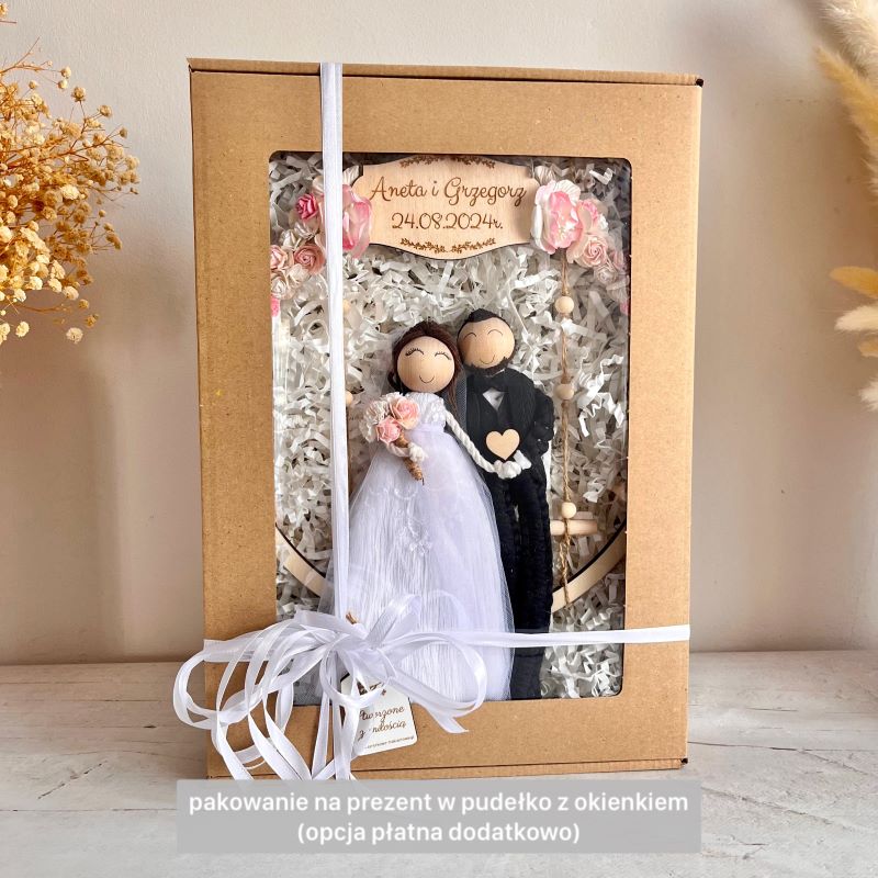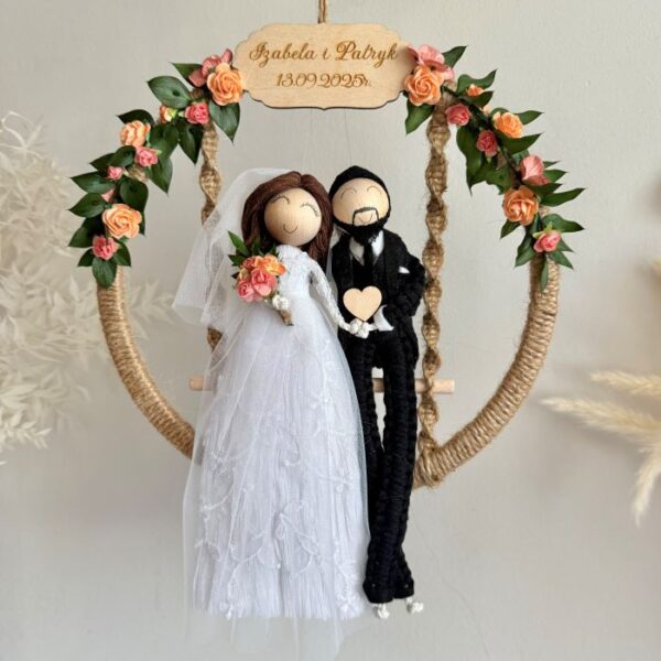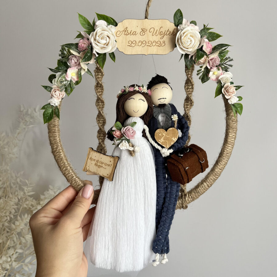 Laleczki siedzą na huśtawce umieszczonej w obręczy owiniętej jutowym sznurkiem i ozdobionej kwiatami. Na górze może znaleźć się tabliczka z imionami lub datą ślubu, jednak jeśli wolisz, przygotuję obręcz bez niej.