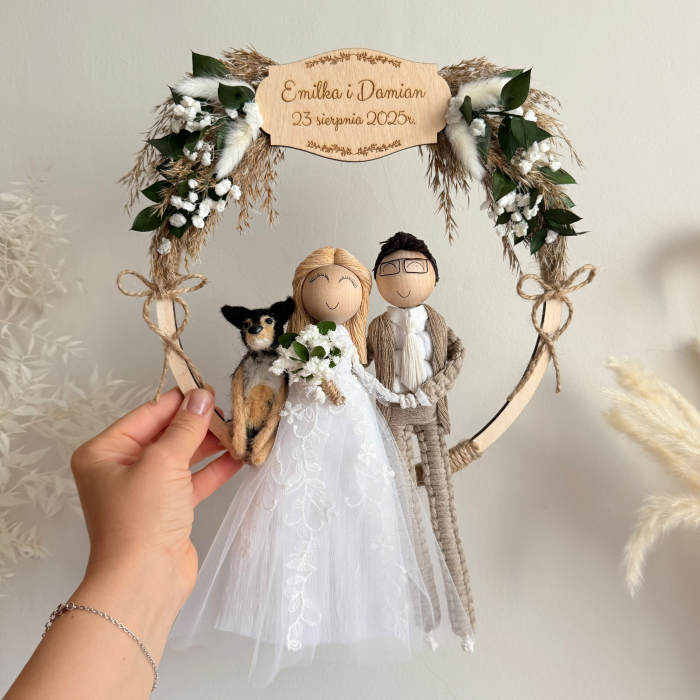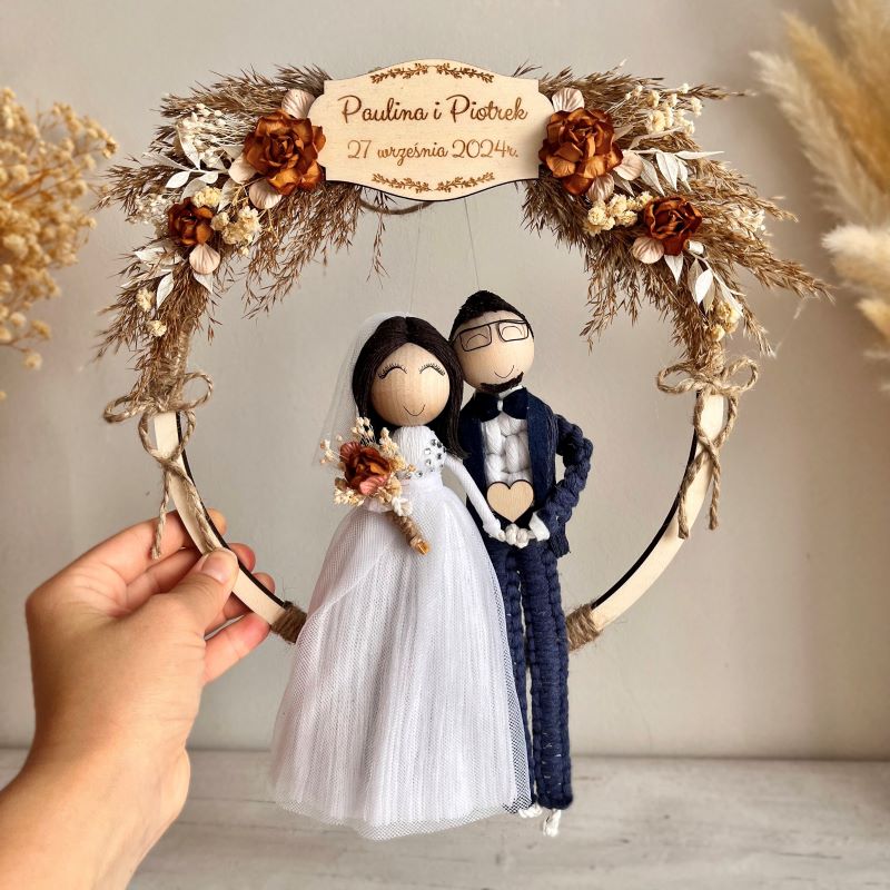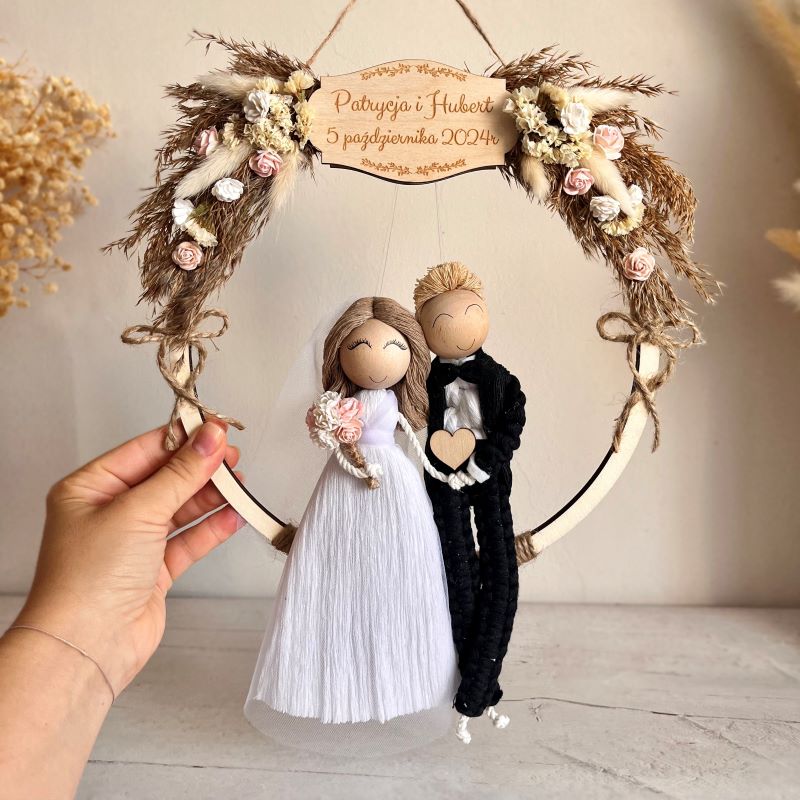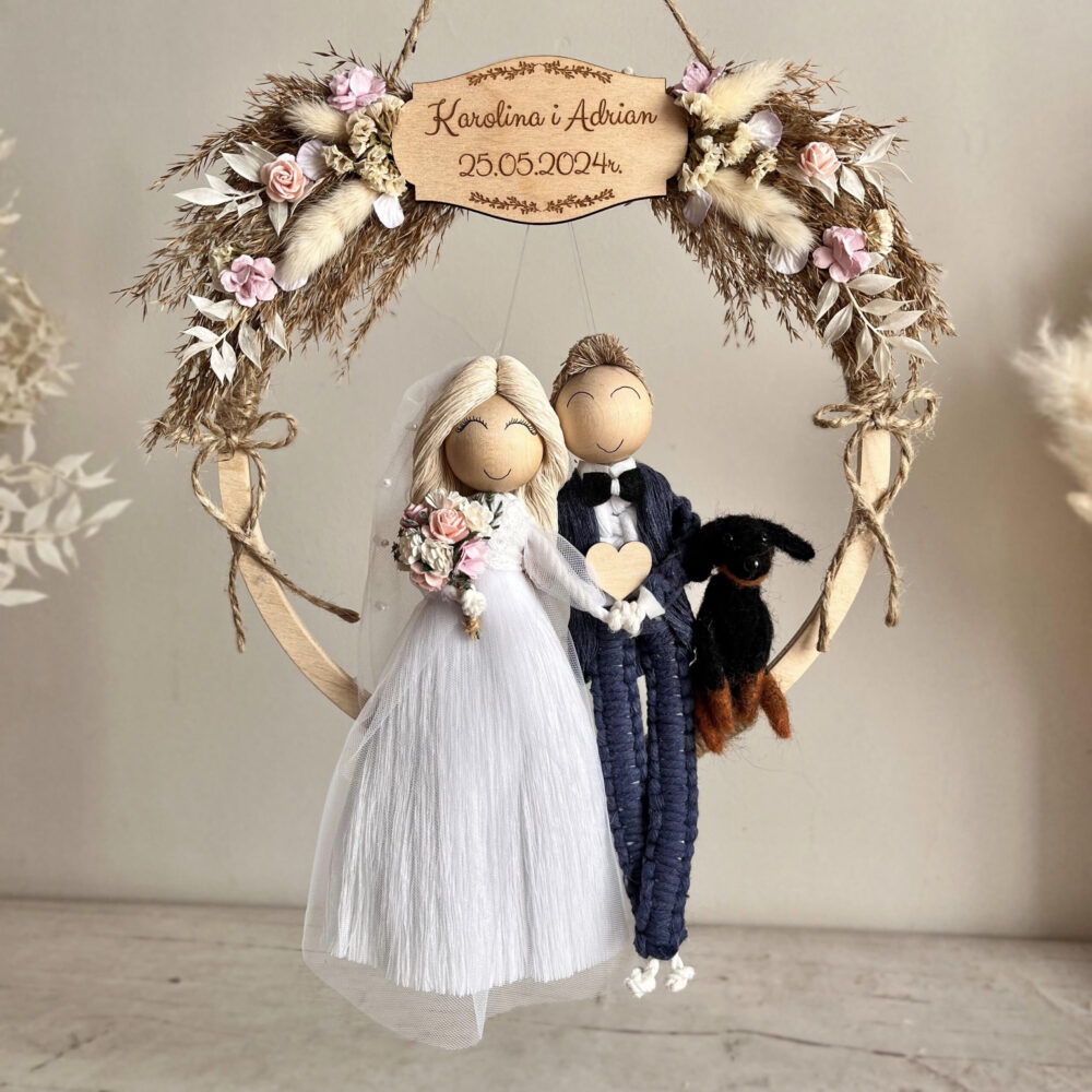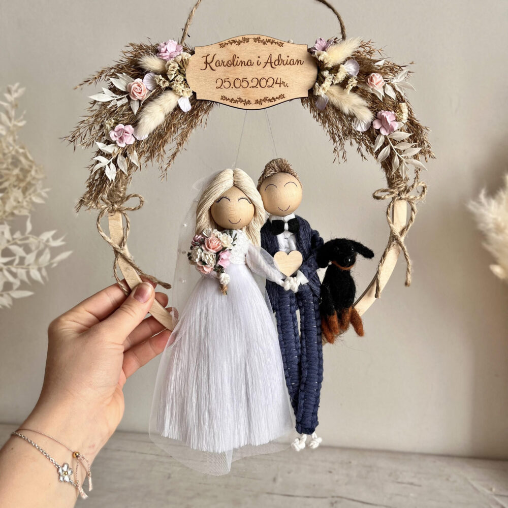 Prezent ślubny, makramowe laleczki w boho wianuszku – personalizowany upominek dla pary młodej