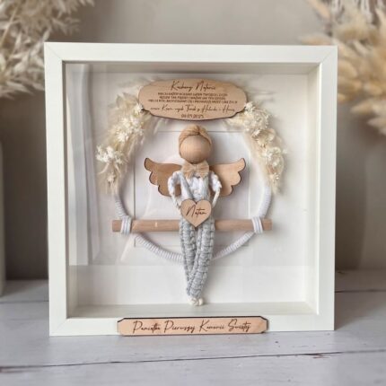 Anioł stróż w ramce dla chłopca na chrzest i komunię, gablotka w stylu boho