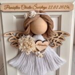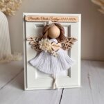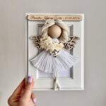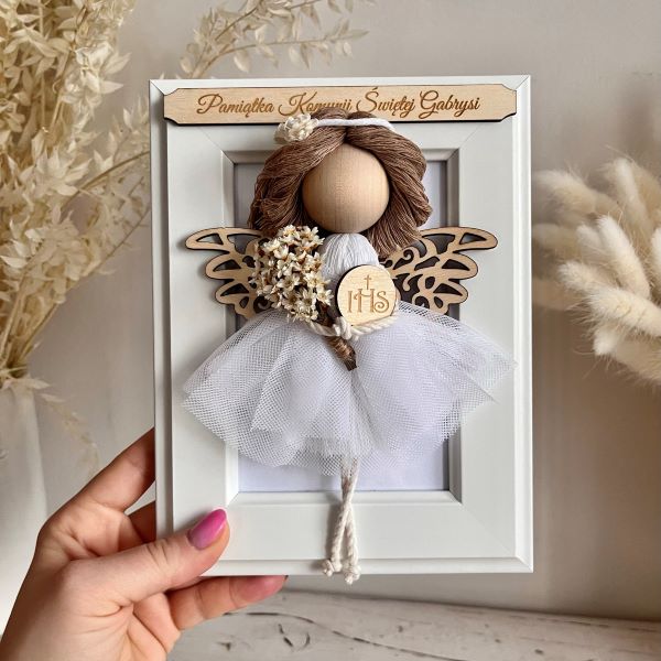 Makramowy aniołek w klasycznej, białej ramce to prosta, a zarazem piękna dekoracja, która sprawdzi się jako pamiątka Komunii, Chrztu, prezent z okazji urodzin lub podziękowanie dla nauczyciela. Dzięki możliwości personalizacji możesz dostosować jego przeznaczenie do okazji. To dekoracja, która dzięki swojej prostocie będzie wspaniałą ozdobą każdego wnętrza. Każdego anioła wykonuję z wielką starannością, z dbałością o każdy detal. Figurki są utrwalane, dzięki czemu sukienka oraz włosy anioła trzymają swoją formę.