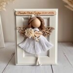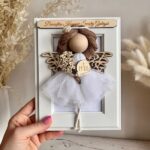 Dekoracja tworzona na zamówienie z dbałością o każdy szczegół i z użyciem bezpiecznych, nietoksycznych materiałów od sprawdzonych dostawców. Wszystkie elementy mocuję trwale i estetycznie, aby zapewnić nie tylko piękny wygląd, ale i bezpieczne użytkowanie. Ramka z aniołkiem pełni funkcję dekoracyjną i najlepiej prezentuje się ustawiona w dobrze widocznym miejscu, na przykład na komodzie, półce lub powieszona na ścianie. Nie jest zabawką, dlatego nie nadaje się do zabawy przez dzieci.