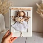 Makramowy anioł stróż w klasycznej ramce- na chrzest, komunię i roczek dziewczynki