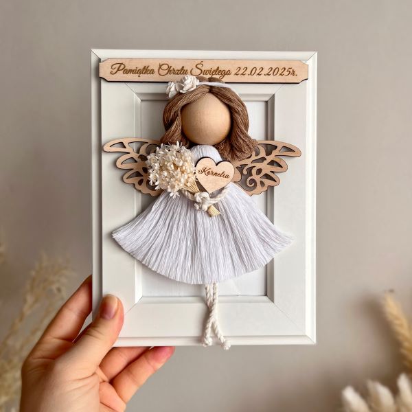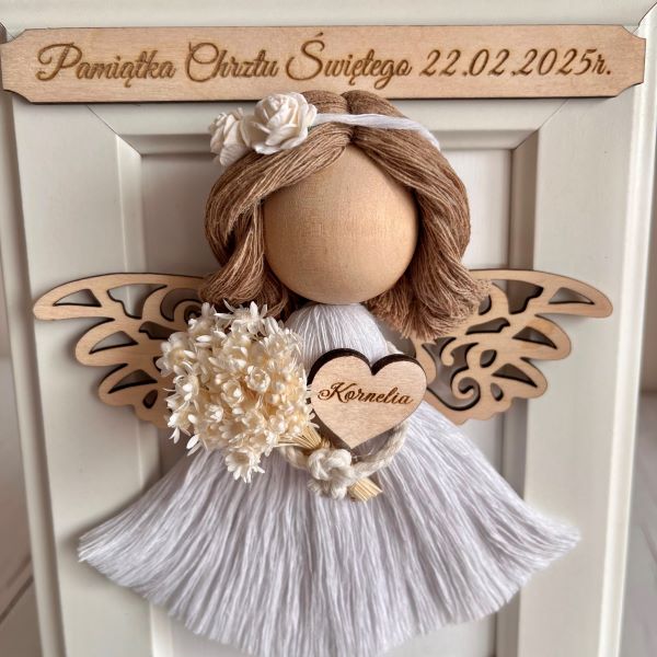 Aniołek wykonany jest z wysokiej jakości sznurka bawełnianego i elementów drewnianych. W rękach anioła znajduje się bukiet suszonych kwiatów i drewniane serce, w którym mogę wygrawerować krótki napis. Na górze ramki jest tabliczka z tekstem. Z tyłu ramki mogę dodać dodatkową tabliczkę z życzeniami, dedykacją lub modlitwą. Dodatkowo możesz określić kolor włosów anioła. Ramka posiada podpórkę (jeśli wybierzesz dodatkową tabliczkę z życzeniami z tyłu to ramka będzie miała zawieszkę).