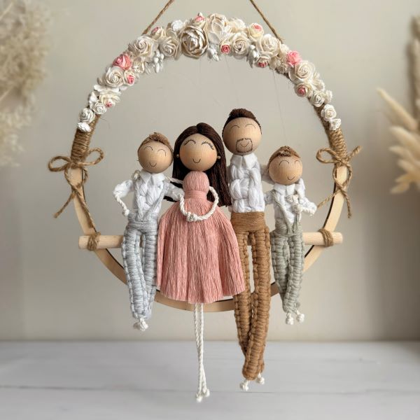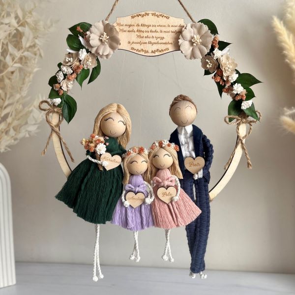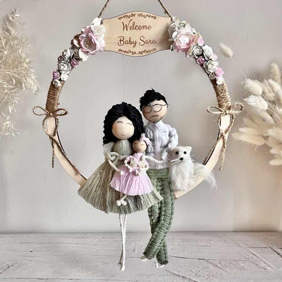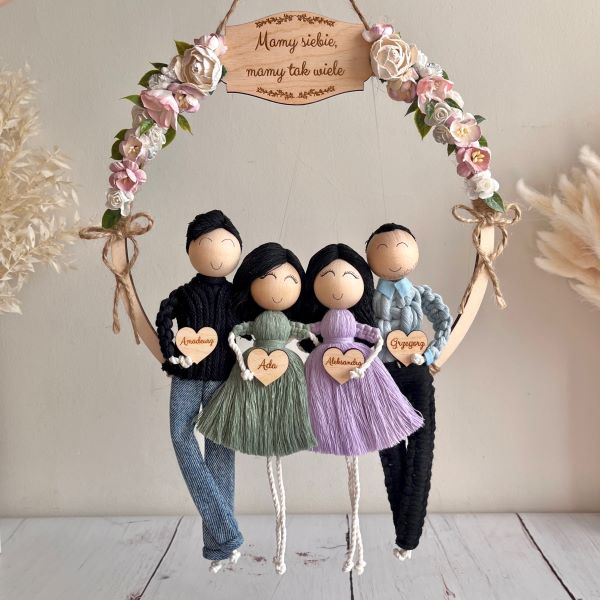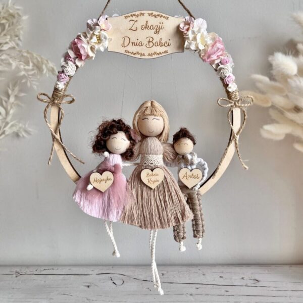 Makramowa rodzinka w obręczy, personalizowane laleczki (kwiaty)