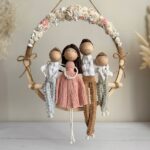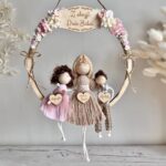 Drewniana obręcz, na której umieszczam laleczki, ozdabiana jest papierowymi kwiatami w wybranej przez Ciebie kolorystyce. Na górze obręczy mogę umieścić drewnianą tabliczkę z nazwiskiem, mottem rodzinnym lub ulubionym cytatem. Jeśli wolisz minimalistyczny wygląd bez tabliczki, wystarczy zaznaczyć to w uwagach do zamówienia.