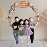 Makramowe rodzinki wykonuję według Twojego opisu lub przesłanych zdjęć. Możesz wskazać kolory włosów, fryzury i ubiór każdej postaci. Laleczki mogą trzymać drewniane serduszka z imionami lub inne gadżety, które nawiązują do ich zainteresowań czy zawodu. Na przykład książka, walizka, stetoskop czy ciasteczka – te dodatki wykonuję ręcznie z modeliny lub drewna. Nawet domowe pupile znajdą swoje miejsce w tej kompozycji.