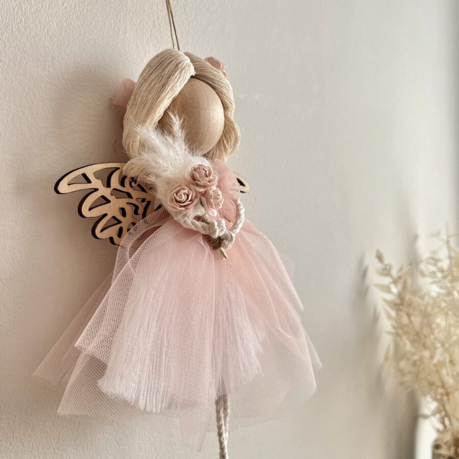 Anioł stróż wykonany z białego sznurka bawełnianego, tiulu w kolorze pudrowego różu (peach) oraz drewnianych elementów. Aniołek trzyma w rękach bukiet z suszonych kwiatów oraz trawy pampasowej. Mogę dodać również serduszko z grawerem (możesz to określić w opcjach zamówienia). Kwiatuszki we włosach i różowa kokarda dodają mu uroku