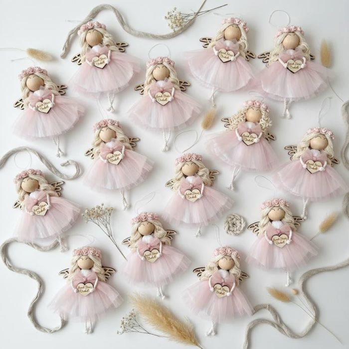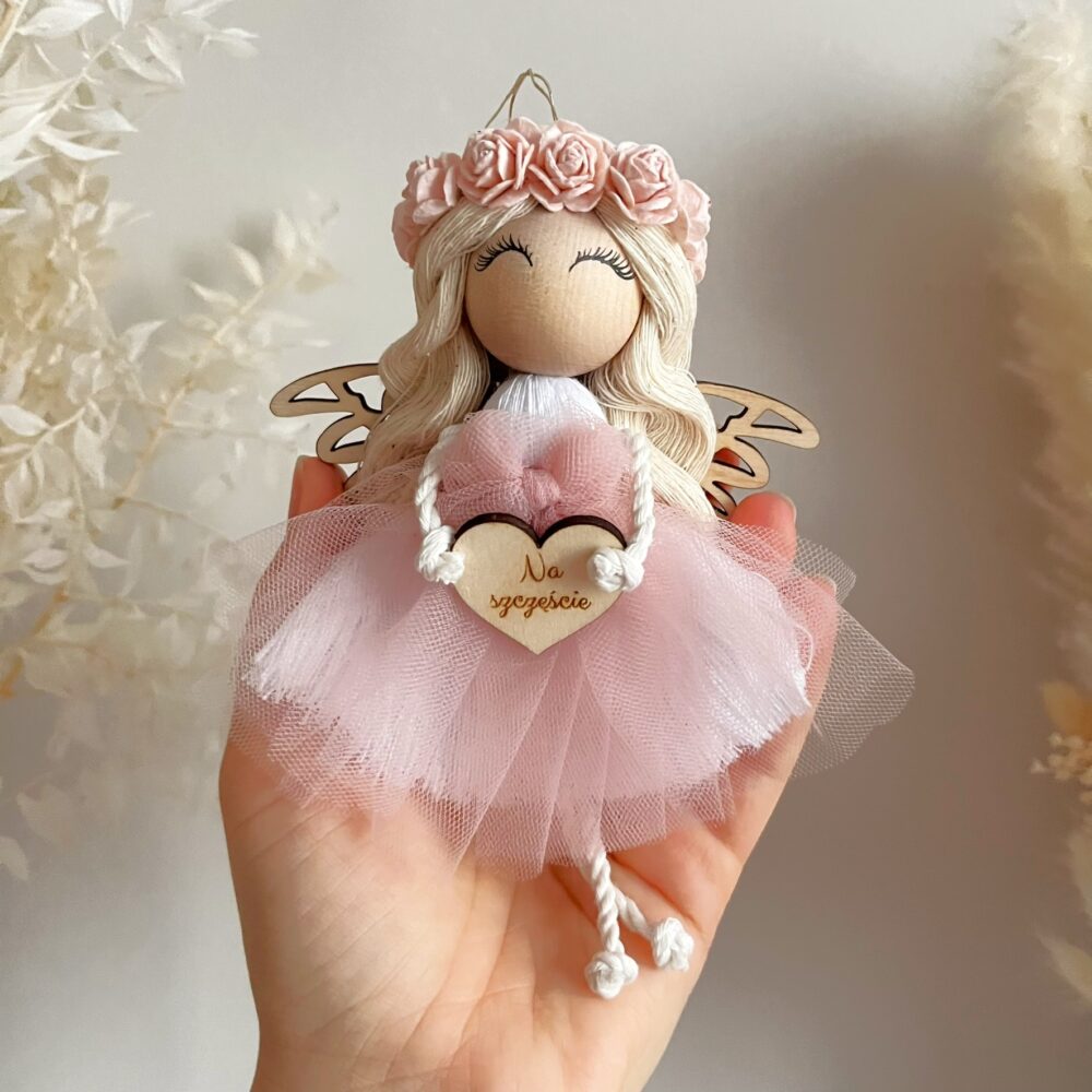 Aniołek wykonany z wysokiej jakości białego sznurka bawełnianego, ozdobiony tiulem w kolorze pastelowego różu. Trzyma w rękach drewniane serduszko z grawerem, które możesz spersonalizować. Włosy aniołka zdobi wianuszek z różowych kwiatów papierowych. Możesz określić kolor włosów aniołka oraz dodać dowolny napis na serduszku.