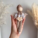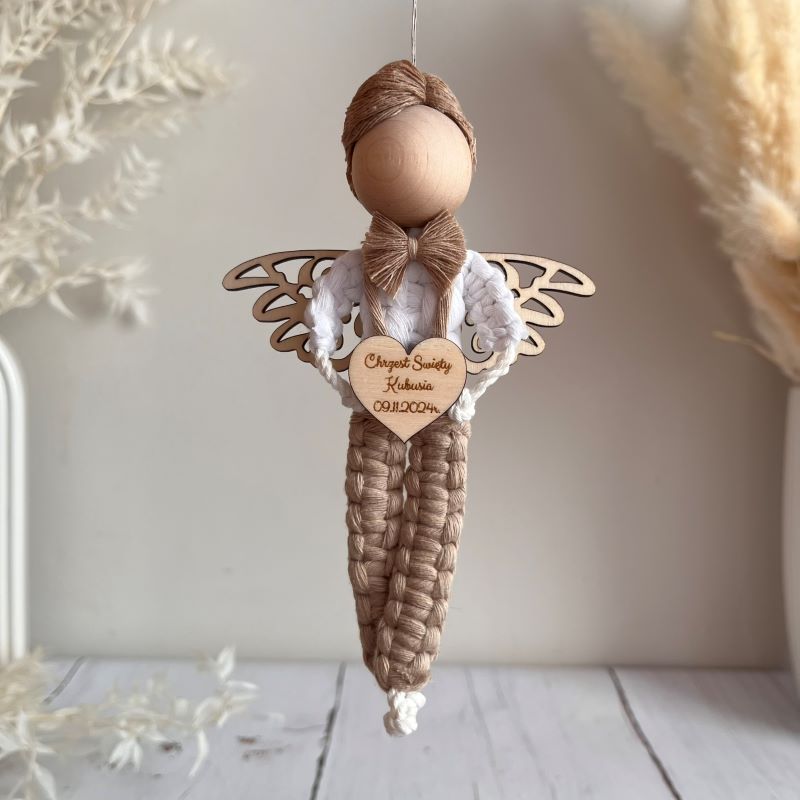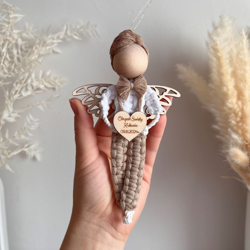 Aniołek wykonany jest z wysokiej jakości sznurka bawełnianego oraz starannie dobranych drewnianych elementów. W jego rączkach znajduje się drewniane serduszko, które można spersonalizować, dodając imię, datę uroczystości lub inne ważne słowo. Dodatkowo, drewniane ażurowe skrzydełka nadają mu elegancji, a mocny magnes lub zawieszka umożliwiają łatwe umiejscowienie aniołka w wybranym miejscu. Możliwość personalizacji aniołka pozwala dostosować go do indywidualnych potrzeb. Wybierz kolor włosów oraz ubranka, aby stworzyć unikalną postać, która doskonale pasuje do stylu obdarowanego. Na serduszku umieszczasz swój tekst, co nadaje prezentowi osobisty charakter, a także sprawia, że staje się niezapomnianą pamiątką.