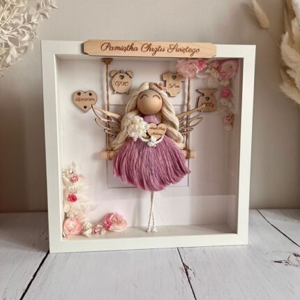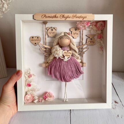 Metryczka dla dziewczynki, anioł stróż makrama gablotka z kwiatami