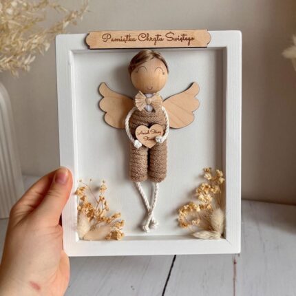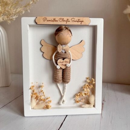 Aniołek dla chłopca makrama, biała ramka na Chrzest i Komunię