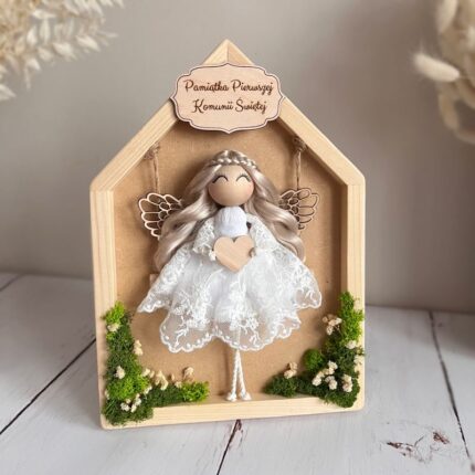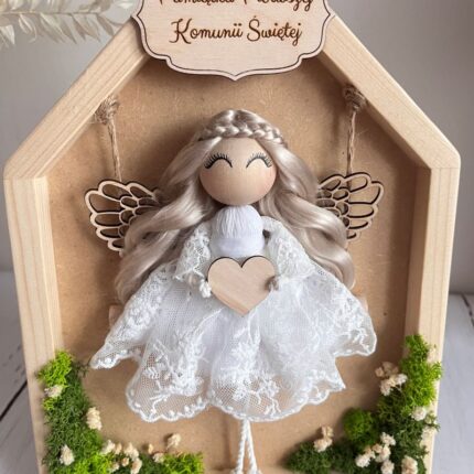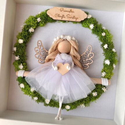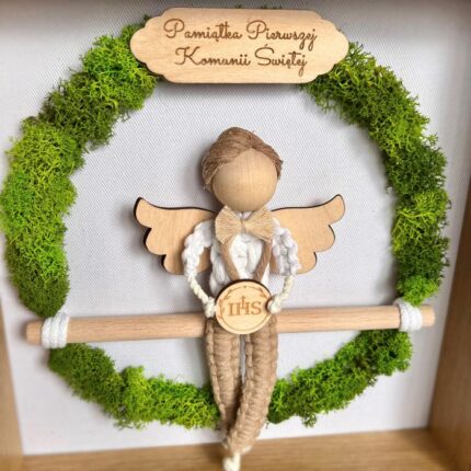 Anioł stróż aniołek makrama, Pamiątka Komunii Świętej, ramka z mchem